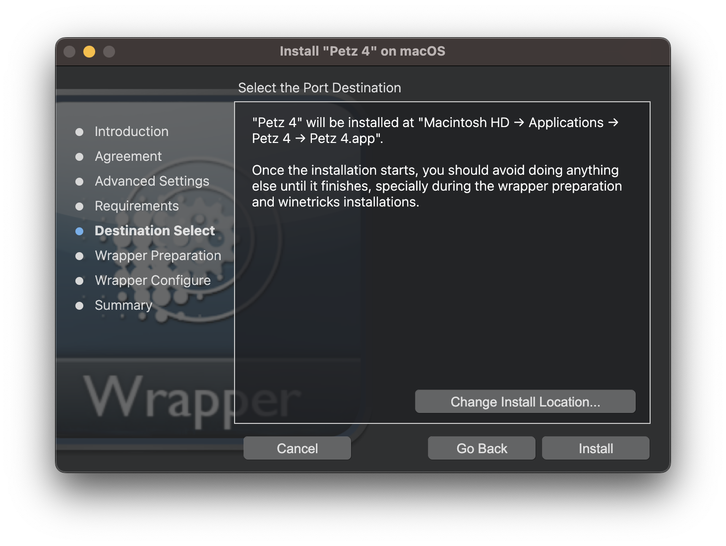 7. Click on "Change Install Location..." to choose your Petz 4 folder within the Applications folder. Your app will live alongside your Petz 4.exe file. Then click the install button to continue.