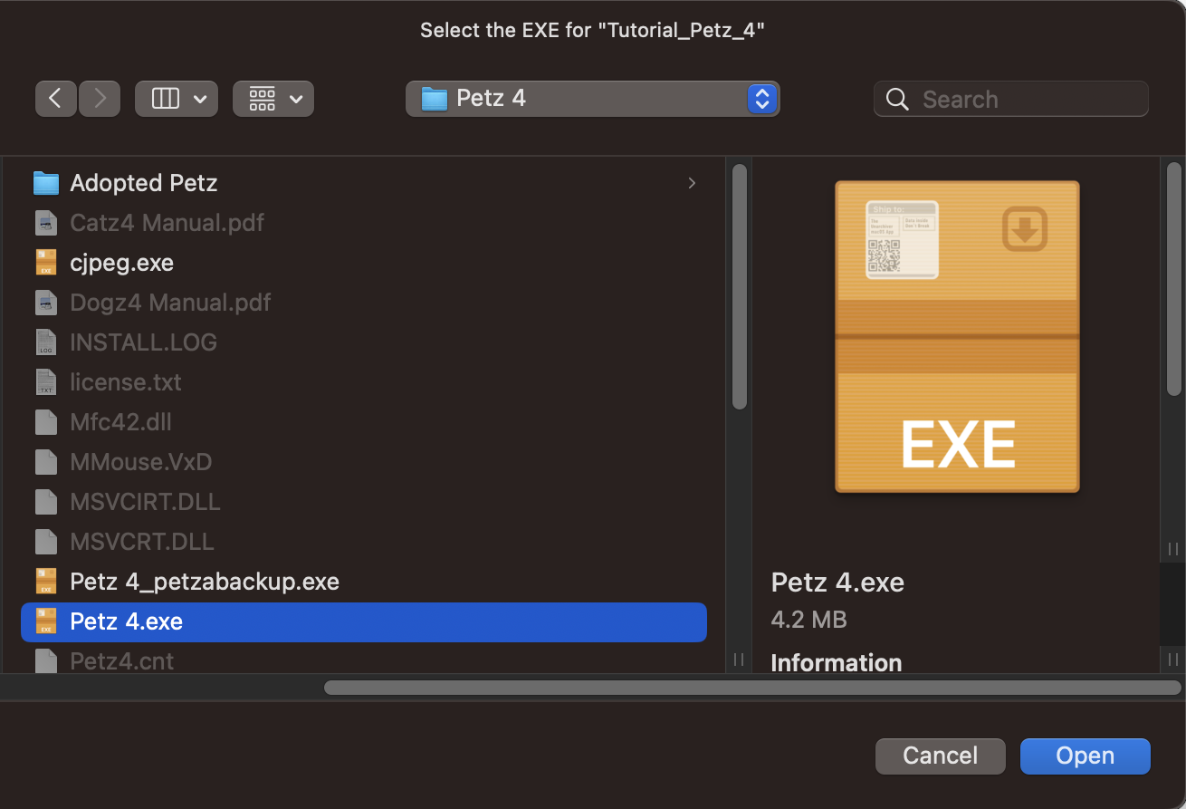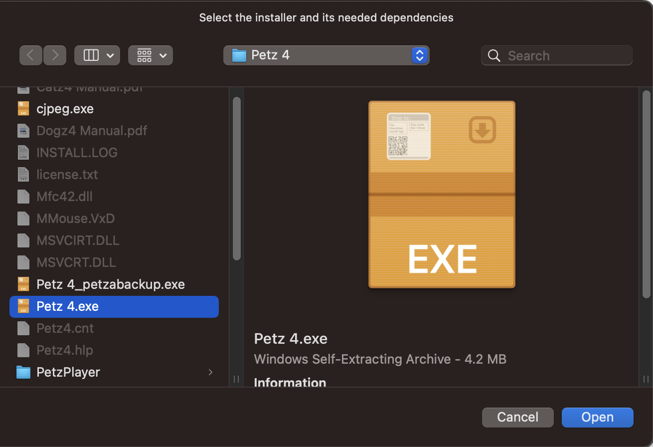 8. A window will pop up asking you to select the installer and needed dependencies. Choose your Petz 4.exe file and click the open button.