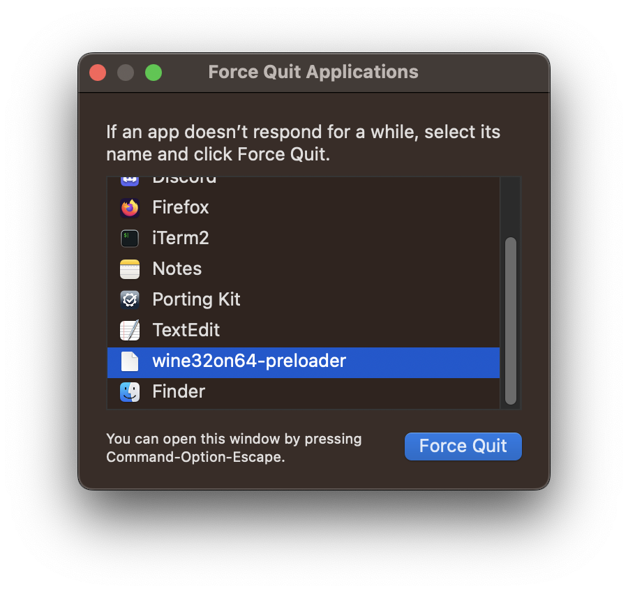 On your keyboard, hold down the option key while you right click the wine32on64-preloader in your Dock and choose Force Quit. Alternatively, you can hold the following keys at the same time to open the Force Quit menu: Command + Option + Escape.